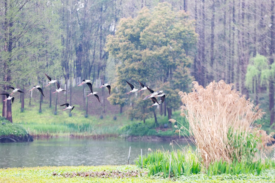 昨天,武康街道英溪公园的中央水景,黑翅长脚鹬成群低飞,红腿掠过水面,与岸边新绿相映成趣。这种对栖息地要求苛刻的鸟类现身城市公园,正是水质清澈、环境安宁的证明。这是德清多年来坚持生态治理的缩影,也是一座城市与自然和谐共生的最好注脚。