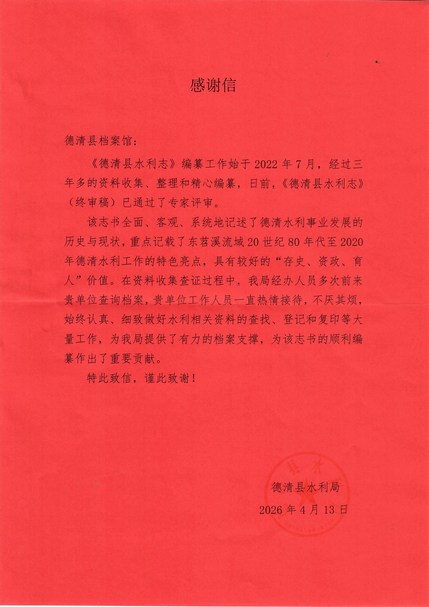近日,德清县档案馆收到一封感谢信,在该馆积极协助下,《德清县水利志》(终审稿)顺利通过专家评审。为确保志书内容真实、数据精准、史料详实,德清县档案馆充分发挥档案资源优势,靠前服务、多措并举,为水利修志工作注入“档案动能”。