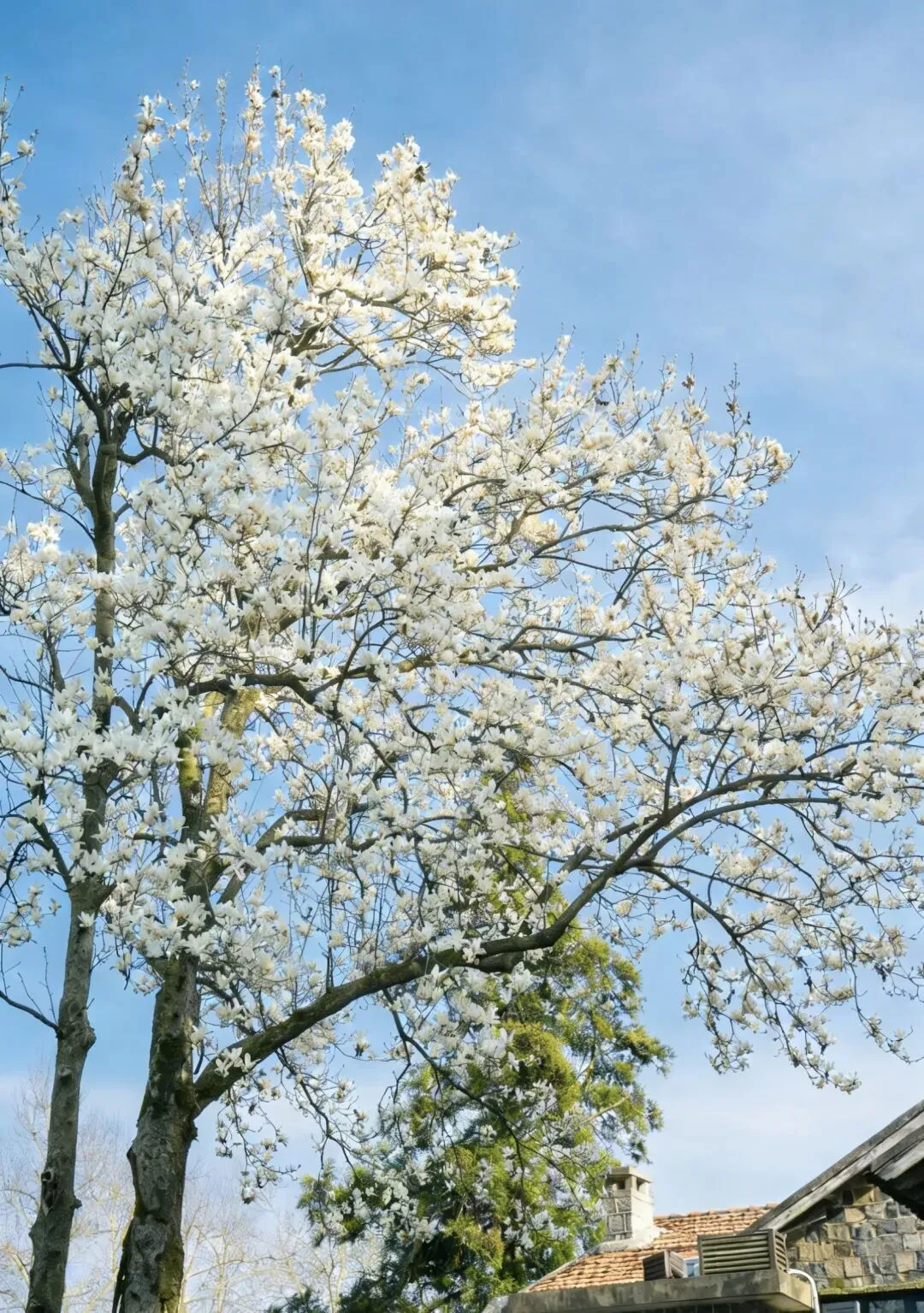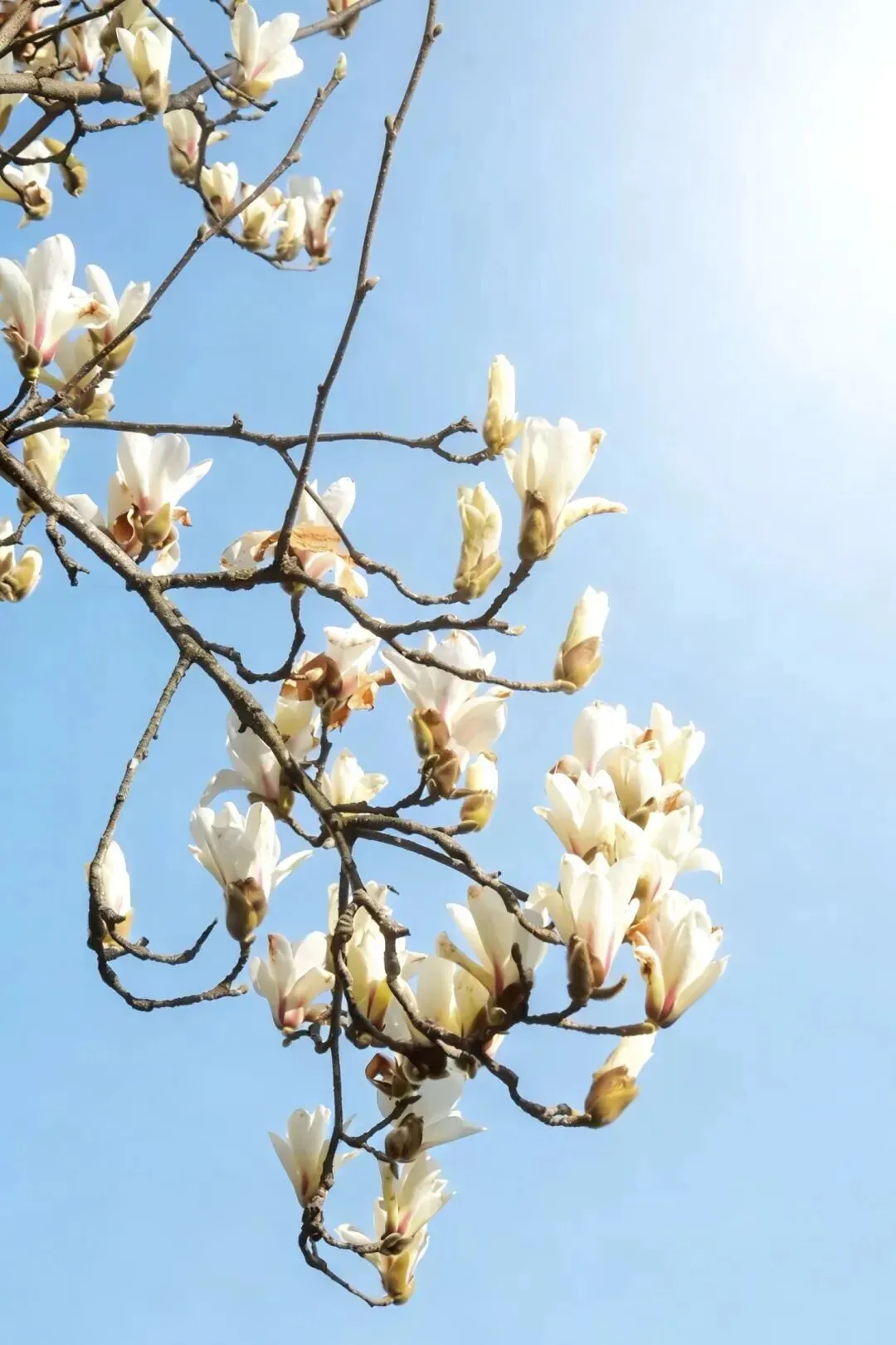 玉兰花以蓝天作幕布,在春日的柔光下显得更加白净透亮,为这趟徒步之旅添上诗意的注脚。