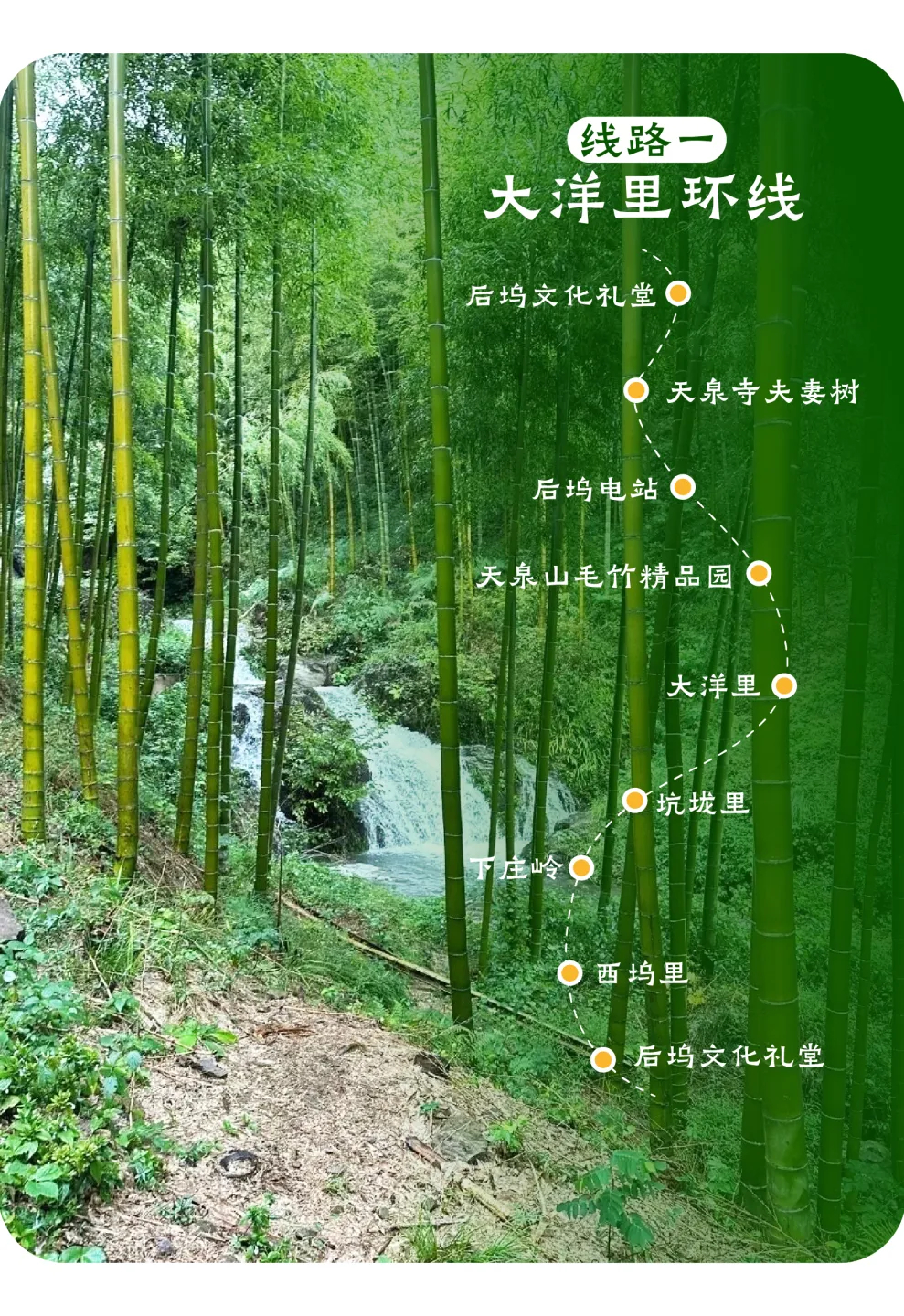 穿过绿意盎然的天泉山毛竹精品园,途经坑垅里、下庄岭,步入西坞里,最后回到起点。